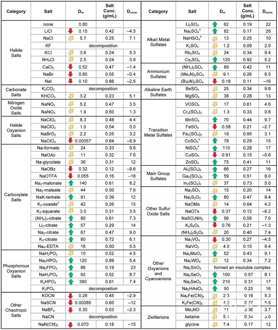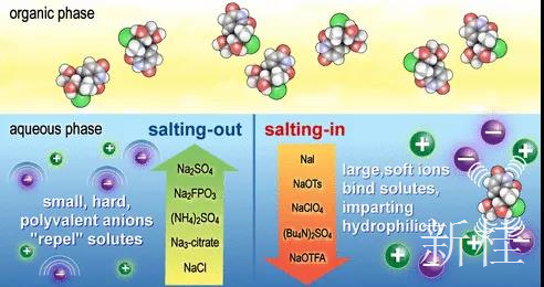 以上例子只是一個引子。今天小編想和大家分享的是萃取中的鹽析效應(yīng)( Salting-Out)。有的產(chǎn)物雖然沒有成鹽,但是它在水里面的溶解度就是很好。這個時候,你有三個選擇:(1)一遍又一遍的萃取,像有的小分子伯胺,在水里面溶解度就很大,幾克的東西萃取好幾升的溶劑。(2)篩選萃取溶劑,搭配醇類溶劑萃取;(3)不改變大的處理過程的前提下,往水里面加點鹽進去,利用鹽析效應(yīng),減小有機物在水中的溶解度。第三種方法Merck團隊還專門發(fā)了篇SCI文章(Org. Process Res. Dev.2017, 21, 1355?1370),重點介紹了這個操作。
