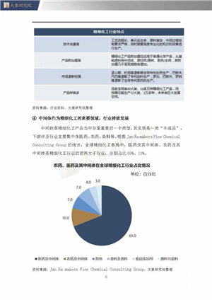 中間體是精細(xì)化工產(chǎn)品當(dāng)中非常重要的一個(gè)類型,其實(shí)質(zhì)是一類“半成品”,下游涉及行業(yè)主要集中在醫(yī)藥、農(nóng)藥、染料等。據(jù)統(tǒng)計(jì),2014年全球精細(xì)化工市場(chǎng)中,醫(yī)藥及其中間體、農(nóng)藥及其中間體是精細(xì)化工行業(yè)的前兩大子行業(yè),分別占比69%、10%。