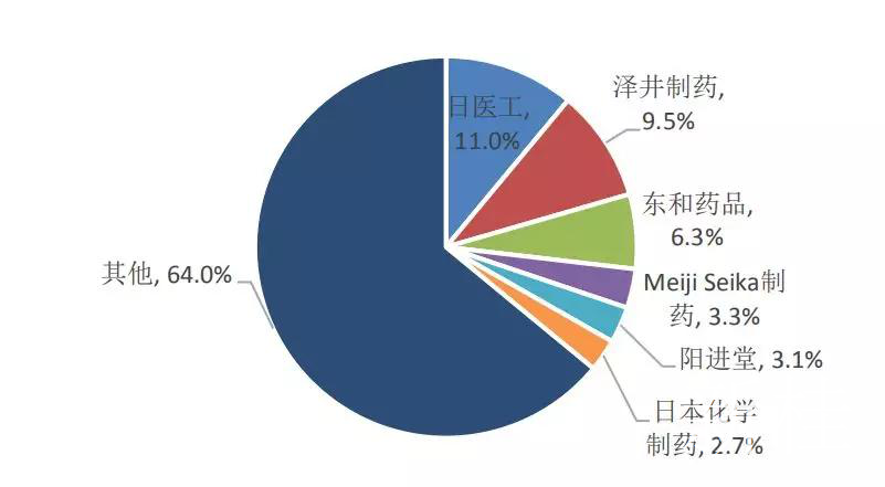 日本仿制藥企業(yè)的數(shù)量在近十年維持在30家左右的水平。其中,2016年日本以仿制藥為主業(yè)的藥企達(dá)到32家,占處方藥企業(yè)數(shù)量的30%左右,占日本所有藥企數(shù)量的11%。從市場份額上看,前六大領(lǐng)軍企業(yè)日醫(yī)工、澤井制藥、東和藥品、Meiji Seika制藥、陽進(jìn)堂和日本化學(xué)制藥合計占據(jù)了36%左右的市場份額