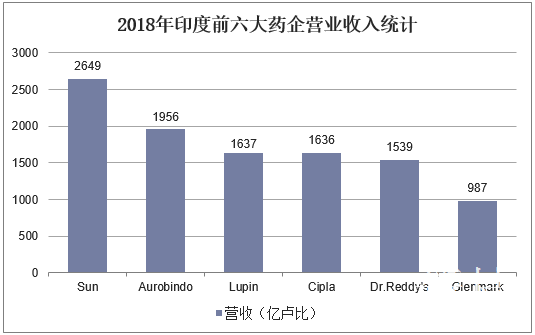從印度的前六大藥企營收來看,Sun、Aurobindo、Lupin、Cipla、DrReddy’s和Glenmark2018年合計銷售額達(dá)到10404億盧比,約合151億美元,約合人民幣1040億元,最大的Sun的銷售額達(dá)到265億元。