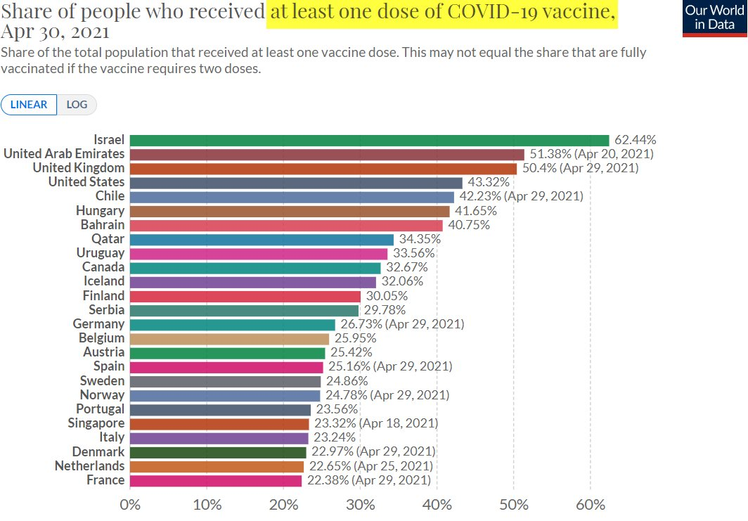 截止4.30日,疫苗接種率較高的國家依次為以色列(62.44%)、阿拉伯(51.38%)、英國(50.4%)、美國(43.32%)、智利(42.23%),數(shù)據(jù)來源于《Our World in Data》。我國人口龐大以及部分人群對疫苗的抵觸,因此新冠疫苗的接種率不高。此前安徽肥西縣因新增新冠病例,使得群眾的疫苗接種意識大大增強,現(xiàn)已接種疫苗超11萬劑次,位居合肥市縣區(qū)第一,截至5月15日肥西縣累計完成核酸檢測11萬人次,結(jié)果均為陰性!美國政府設(shè)定的疫苗接種率目標為7月4日前達到70%,目前65歲以上的老年人群中,超過82%的人至少接種了一針疫苗。