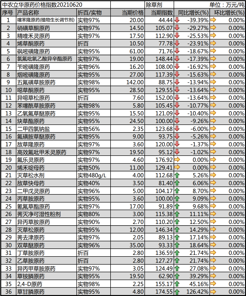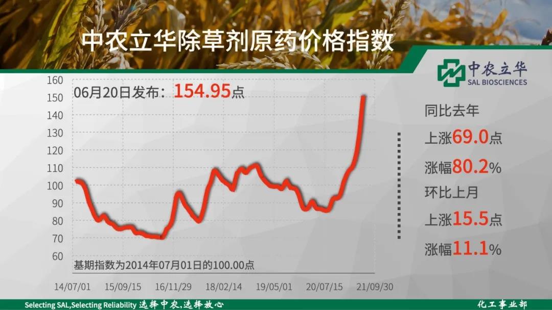 除草劑進(jìn)入傳統(tǒng)用藥淡季,需求開始回落,但滅生性除草劑均大幅上漲。2021年06月20日中農(nóng)立華除草劑原藥價(jià)格指數(shù)報(bào)154.95點(diǎn),其中草甘膦原藥繼續(xù)暴漲,創(chuàng)出近十年歷史新高。