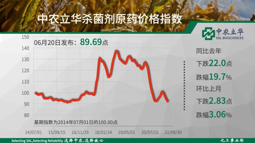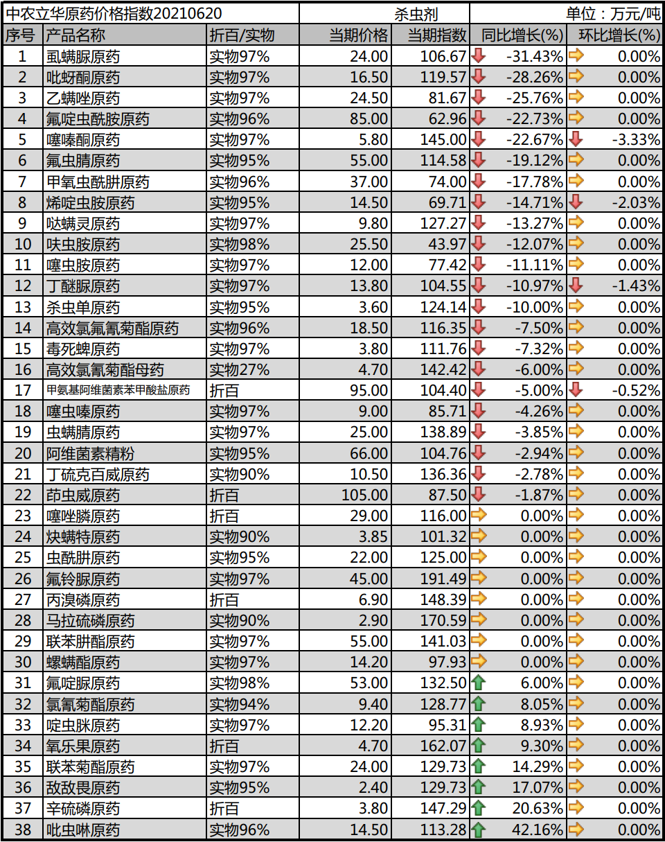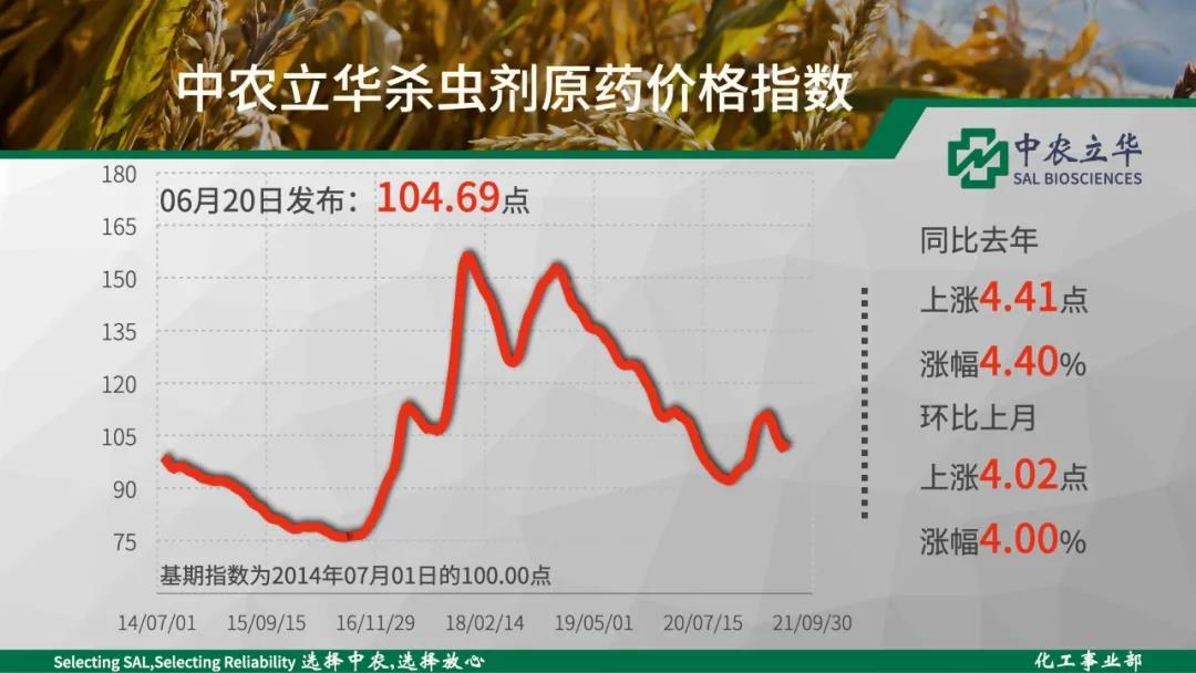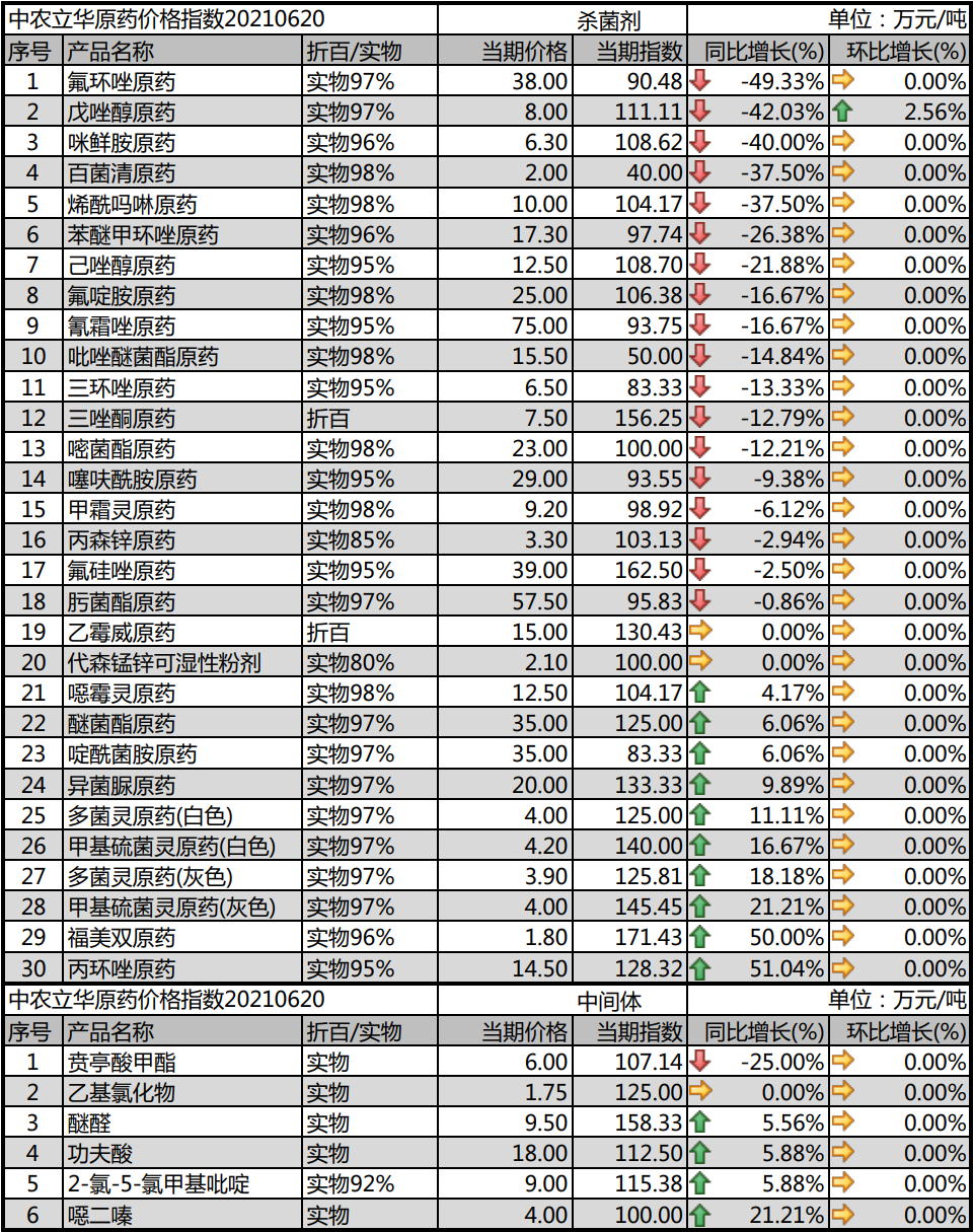 2021年06月20日中農(nóng)立華殺蟲劑原藥價(jià)格指數(shù)報(bào)104.69點(diǎn),環(huán)比上月大幅上漲4.00%。上漲:氯氰菊酯原藥、聯(lián)苯菊酯原藥、敵敵畏原藥、氧樂果原藥、吡蟲啉原藥、氟啶脲原藥、辛硫磷原藥、啶蟲脒原藥等持平:噻唑膦原藥、炔螨特原藥、蟲酰肼原藥、氟鈴脲原藥、丙溴磷原藥、馬拉硫磷原藥、聯(lián)苯肼酯原藥、螺螨酯原藥等下跌:噻嗪酮原藥、烯啶蟲胺原藥、丁醚脲原藥、甲氨基阿維菌素苯甲酸鹽原藥等 //05//殺菌劑和中間體
