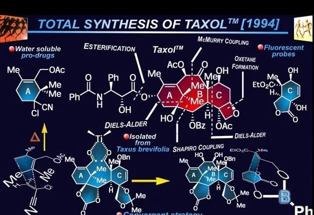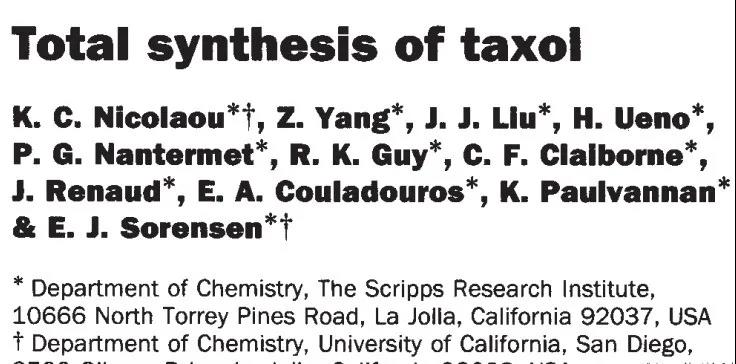 先后共有30多個(gè)研究組參與研究,化學(xué)家們投入大量人力和財(cái)力進(jìn)行了幾十萬(wàn)次實(shí)驗(yàn),實(shí)屬罕見(jiàn)。而Nicolaou教授指導(dǎo)下紫杉醇合成的成功,在有機(jī)化學(xué)和抗腫瘤藥物研發(fā)領(lǐng)域意義非凡。1994年2月17日,Nature雜志首先報(bào)道了taxol的全合成。