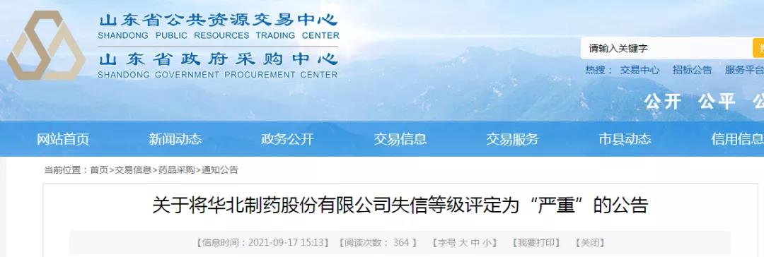 2021年9月17日,山東省公共資源交易中心發(fā)布關(guān)于將華北制藥股份有限公司失信等級評定為“嚴(yán)重”的公告。