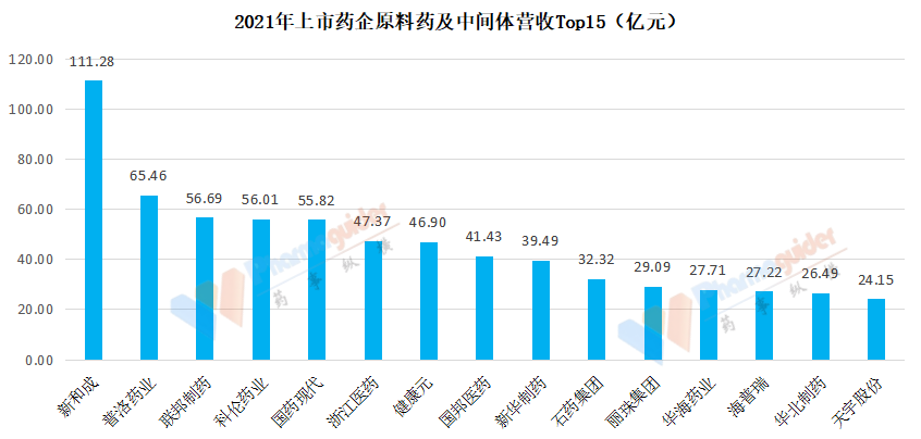 總的來說,前5名公司的原料藥及中間體業(yè)務營收都在50億元以上,top15的營收都在20億元以上。