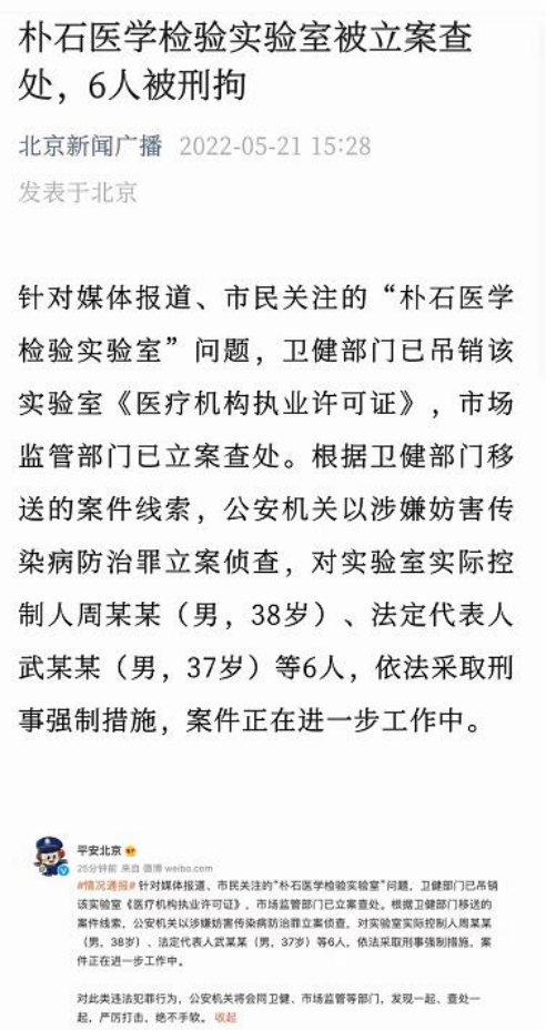 據(jù)平安北京微信公眾號(hào)消息,針對(duì)媒體報(bào)道、市民關(guān)注的“樸石醫(yī)學(xué)檢驗(yàn)實(shí)驗(yàn)室”問(wèn)題,衛(wèi)健部門已吊銷該實(shí)驗(yàn)室《醫(yī)療機(jī)構(gòu)執(zhí)業(yè)許可證》,市場(chǎng)監(jiān)管部門已立案查處。