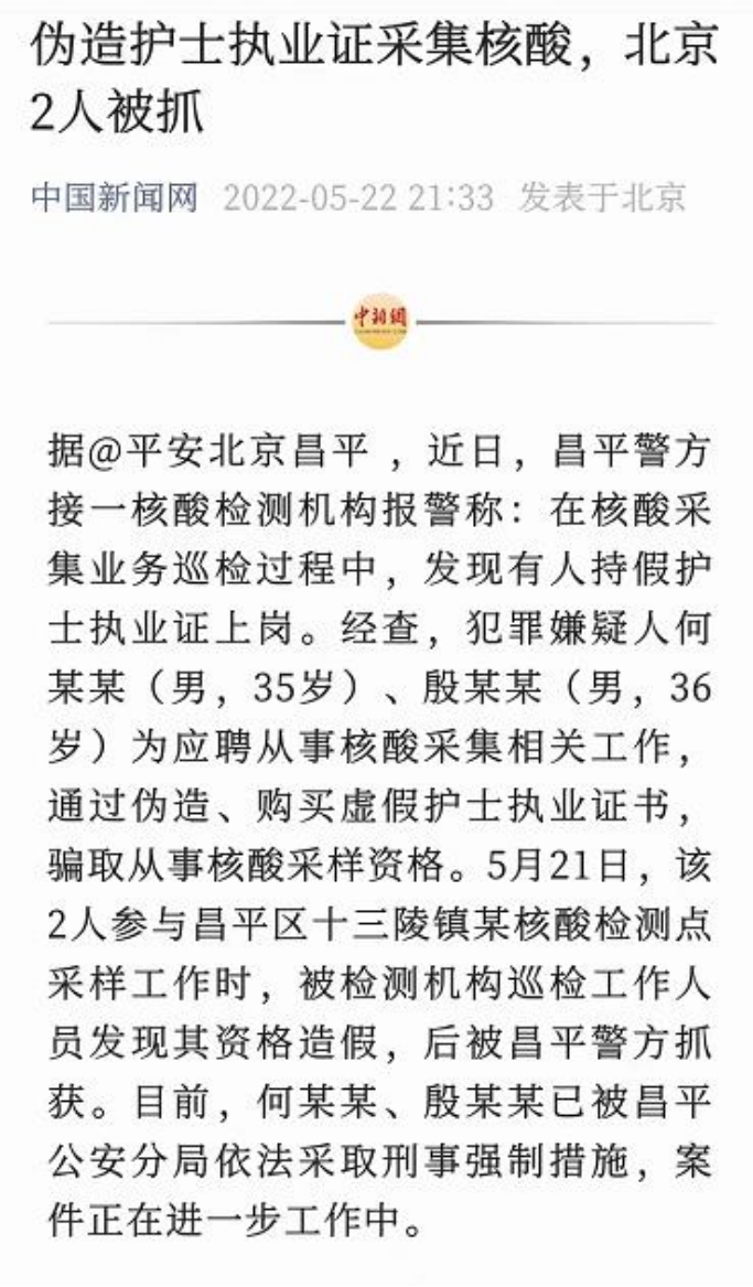 北京市公安局昌平分局官方微博發(fā)布消息,近日昌平警方接一核酸檢測(cè)機(jī)構(gòu)報(bào)警稱:在核酸采集業(yè)務(wù)巡檢過(guò)程中,發(fā)現(xiàn)有人持假護(hù)士執(zhí)業(yè)證上崗。經(jīng)查,犯罪嫌疑人何某某(男,35歲)、殷某某(男,36歲)為應(yīng)聘從事核酸采集相關(guān)工作,通過(guò)偽造、購(gòu)買虛假護(hù)士執(zhí)業(yè)證書(shū),騙取從事核酸采樣資格。