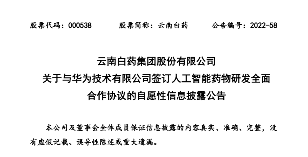 7月25日,云南白藥公告稱,與華為達成全面合作,雙方將在人工智能藥物研發(fā)領(lǐng)域開展交流與合作,探索聯(lián)合科研創(chuàng)新機制,包括但不限于大小分子設(shè)計、相關(guān)病癥、數(shù)據(jù)庫開發(fā)等。