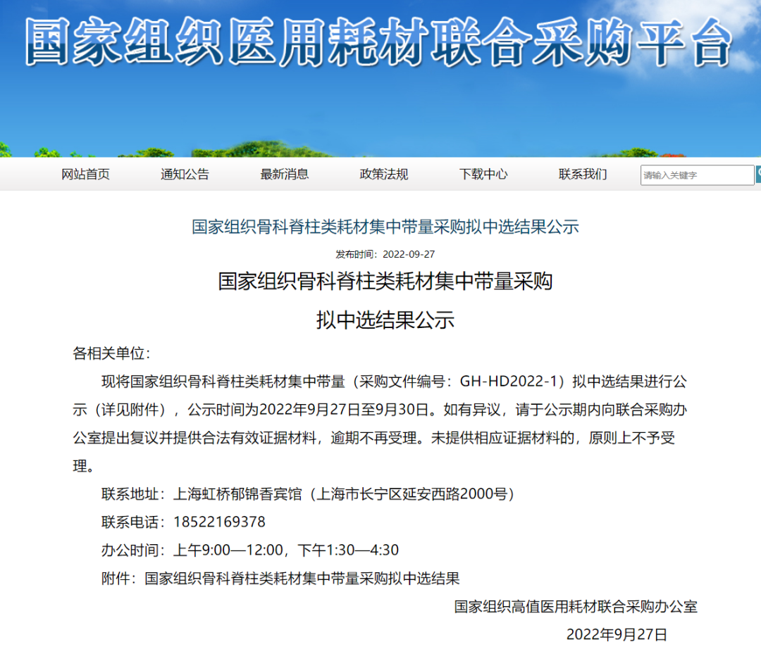 927日,國(guó)家組織骨科脊柱類(lèi)耗材集中帶量采購(gòu)在上海接受企業(yè)遞交申報(bào)材料并現(xiàn)場(chǎng)開(kāi)標(biāo)。晚間,國(guó)家組織高值醫(yī)用耗材聯(lián)合采購(gòu)辦公室官宣國(guó)家組織骨科脊柱類(lèi)耗材集中帶量采購(gòu)擬中選結(jié)果詳見(jiàn)文末表格