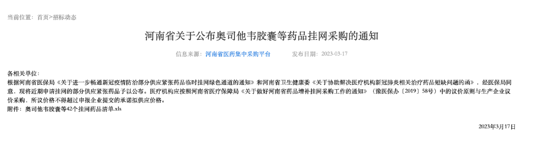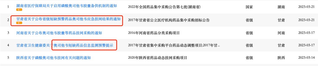 3月21日,甘肅省發(fā)布《關(guān)于公布省級短缺預(yù)警藥品奧司他韋應(yīng)急掛網(wǎng)結(jié)果的通知》;同一天,湖南省醫(yī)保局發(fā)布《關(guān)于啟用磷酸奧司他韋膠囊備供機(jī)制的通知》;前幾日,河南、甘肅也陸續(xù)發(fā)布相關(guān)文件。
