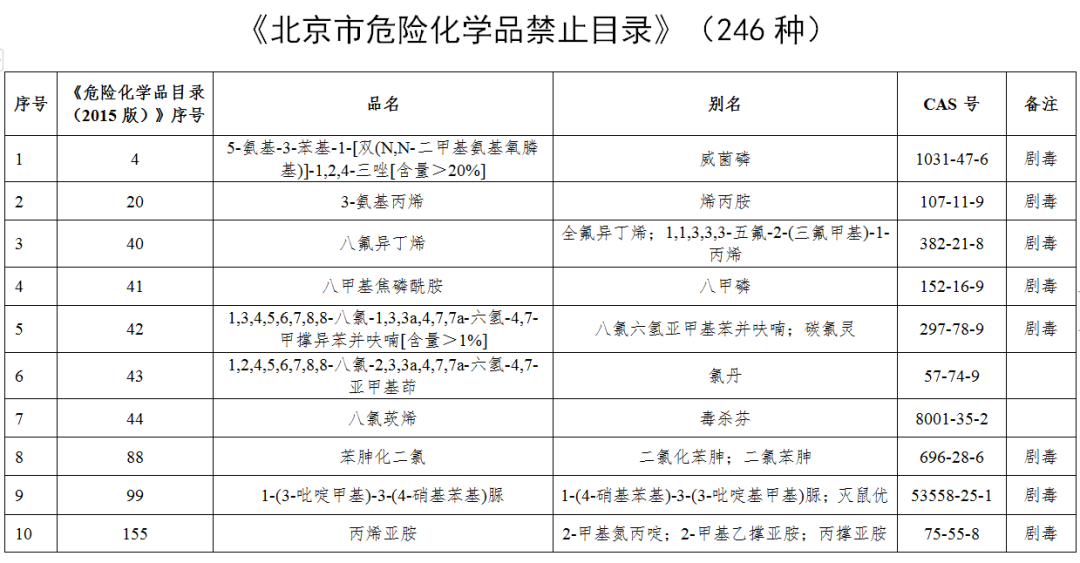 八甲磷、克百威、毒鼠強(qiáng)、水銀等246種?;窋M被列入禁止目錄,在北京行政區(qū)域內(nèi)禁止生產(chǎn)、儲存、使用、經(jīng)營和運(yùn)輸(含過境運(yùn)輸)。確需使用且符合首都功能定位和產(chǎn)業(yè)發(fā)展需求的,只能以符合要求的化學(xué)試劑包裝和氣瓶氣體形式使用和運(yùn)輸。
