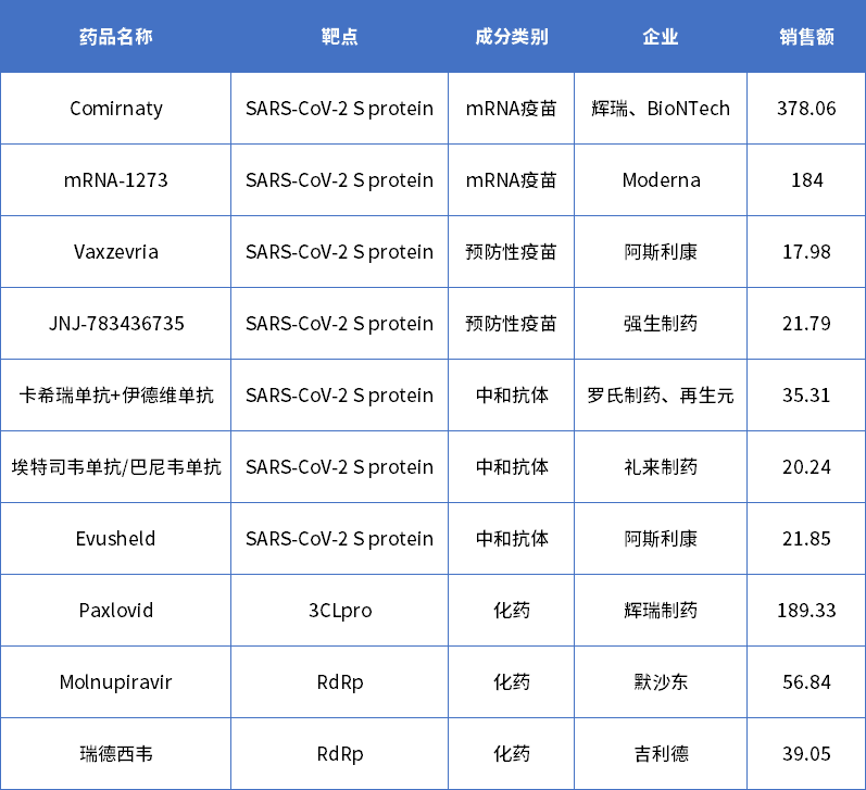 表1 新冠相關產(chǎn)品2022年度銷售額(單位:億美元)