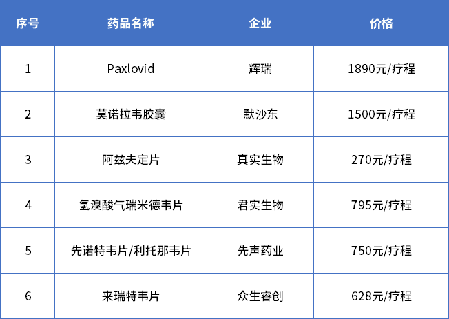 表2 國內(nèi)已獲批上市的6款新冠小分子口服藥價格