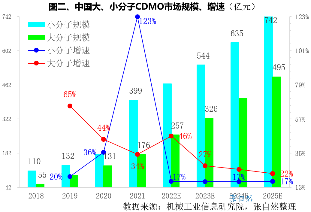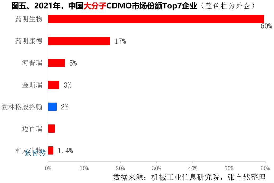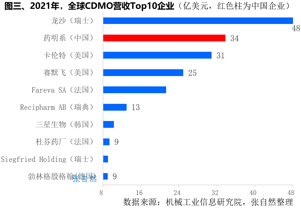 所謂CDMO,即定制研發(fā)生產(chǎn)機構(gòu)(Contract Development and Manufacturing Organization),主要為藥企提供臨床新藥工藝開發(fā)和制備,以及為已上市藥物提供工藝優(yōu)化和規(guī)?;a(chǎn)服務(wù)。CDMO產(chǎn)業(yè)在我國發(fā)展之迅猛可謂一時無兩,盡管近期資本市場有所波動,但優(yōu)勢尚存,增勢不減。目前,全球CDMO行業(yè)仍處于高速發(fā)展期,按沙利文統(tǒng)計口徑,全球CDMO市場規(guī)模由2017年的394億美元增長到了2021年的632 億美元,到2025年將達到1243億美元。2015年開啟的醫(yī)藥創(chuàng)新熱潮促進了我國CDMO產(chǎn)業(yè)的高速發(fā)展,我國CDMO市場規(guī)模由2017年的132億元增長到了2021年的473億元,4年增長了2.6倍,復(fù)合年增長率高達37.7%,2倍于同期全球CDMO18.5%的復(fù)合增長率,預(yù)計到2025年將達到1571億元。我國CDMO市場規(guī)模在全球的占比也由2017年的5%提高到了2021年的13%,到2025年將占到全球市場的1/5。(詳見圖一)小分子一直在我國CDMO產(chǎn)業(yè)占據(jù)主導(dǎo)地位,按機械工業(yè)信息研究院統(tǒng)計口徑,我國小分子CDMO市場規(guī)模由2018年的110億元增長到了2021年的399億元,3年增長了2.6倍,預(yù)計2025年將達到742億元。我國大分子CDMO的市場規(guī)模由2018年的55億元增加到了2021年的176億元,預(yù)計到2025年將增加到近500億元(495億元)。2018年到2021年,我國大分子CDMO的復(fù)合增長率為47.4%,稍低于小分子的53.6%。受益于細分領(lǐng)域的突破,2021年-2026年,大分子的復(fù)合增長率將達到27.3%,將遠高于同期小分子16.8%的復(fù)合增長率。(詳見圖二)2021年,全球CDMO營收最大的企業(yè)是瑞士龍沙和我國的藥明系(藥明康德+藥明生物)。在Top10企業(yè)中,歐洲占了6席,美國和亞洲各占2席。如按國家來劃分的話,瑞士、美國和法國各占2席,即瑞士的龍沙(48億美元,第1位)、Siegfried Holding(9億美元,第9位),美國的卡倫特(31億美元,第3位)、賽默飛(25億美元,第4位)和法國的Fareva SA(21億美元,第5位)、杜芬藥廠(9億美元,第8位)。另有4個國家各占1席,即中國的藥明系(34億美元,第2位)、瑞典的Recipharm AB(13億美元,第6位)、韓國的三星生物(10億美元,第7位)和德國的勃林格殷格翰(9億美元,第10位)。(詳見圖三)2021年,在我國小分子CDMO市場份額Top10企業(yè)中,竟有4家來自同一個省的同一個地級市--浙江省臺州市,即九洲藥業(yè)、普洛藥業(yè)、聯(lián)盛科技和天宇股份,皆因臺州是我國乃至全球最重要的化學(xué)原料藥基地,知名原料藥企業(yè)海正、華海、司太立和海翔藥業(yè)等均位于臺州。帶量采購導(dǎo)致的藥價下降大大促進了藥品使用量的提升,原料藥的消耗量也隨之大幅增加,同時也推動了原料藥企業(yè)向下游制劑環(huán)節(jié)的延伸。臺州作為原料藥基地,在帶量采購背景下,其成本和技術(shù)優(yōu)勢凸顯,從而實現(xiàn)了產(chǎn)業(yè)鏈的延伸和產(chǎn)業(yè)升級。在小分子市場份額Top10企業(yè)中,市場份額最大的是藥明康德(占了35%)。其次是后起之秀凱萊英(占11%),2022年前9個月,凱萊英營收同比增長高達167%,傲視群雄,歸母凈利增速更是高達292%。其后分別是博騰股份(8%)、康龍化成(4.4%)和圣諾生物(1.6%)。(詳見圖四)我國小分子CDMO企業(yè)格局相對穩(wěn)定,大分子CDMO企業(yè)集中度高企。2021年,大分子CDMO市場份額最大的企業(yè)是藥明系(藥明生物+藥明康德),占了近8成市場(77%)。其次是金斯瑞(3%)、邁百瑞(1.8%)和和元生物(1.4%)。在Top企業(yè)中還有一家外企,即德國的勃林格殷格翰,占了2%的市場,如勃林格殷格翰為上海之江生物的新冠雙特異性抗體藥物SYZJ001提供工藝優(yōu)化及生產(chǎn)制造服務(wù)。(詳見圖五)國內(nèi)CDMO企業(yè)多服務(wù)于臨床階段的工藝開發(fā)和研究,因此需要大量的研發(fā)人員,如藥明生物、凱萊英等企業(yè)的研發(fā)人員數(shù)量占到了員工總數(shù)的40%以上,工程師紅利促進了我國CDMO產(chǎn)業(yè)的高速發(fā)展。2020年,全球重點CDMO企業(yè)中,人工成本最低的是我國的凱萊英,其單位人工成本為2.4萬美元/人,只有瑞士Siegfried Holding(12.4萬美元/人)的不到1/5。其次是我國的博騰股份(2.8萬美元/人)和藥明康德(3萬美元/人)也都遠低于瑞士龍沙的11.8萬美元/人、韓國三星生物的8.1萬美元/人。