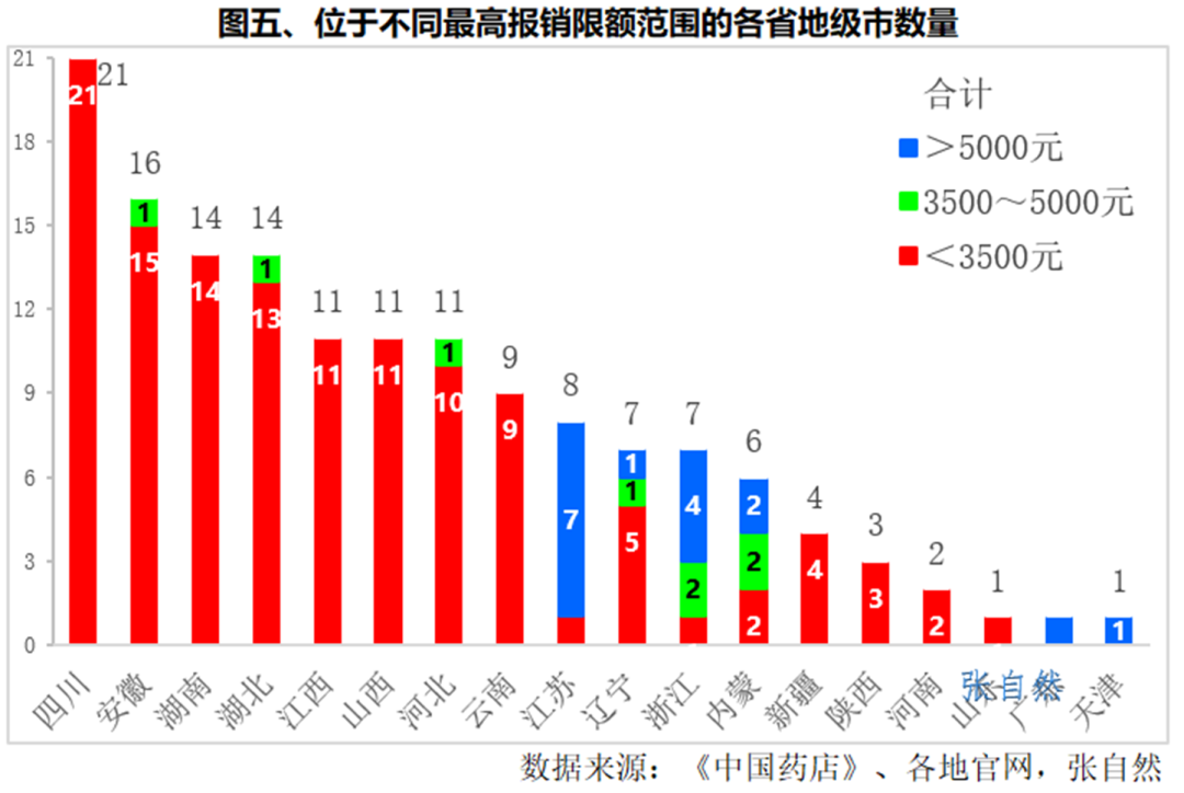 起付線<200元的占了1/3,涉及5省的46個(gè)地級(jí)市,即四川(21個(gè)市)、河北(10個(gè)市)、云南(9個(gè)市)等;