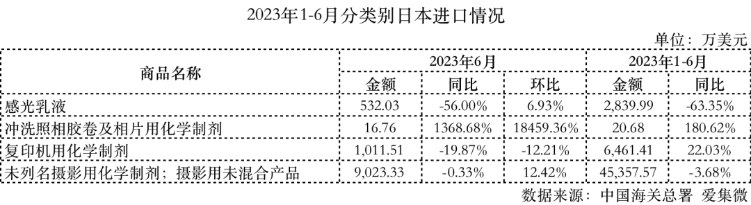 按國內(nèi)分注冊(cè)地進(jìn)口情況看,2023年1-6月感光化學(xué)品進(jìn)口量前三的是廣東省、江蘇省和上海市,占比分別是20.2%、16.2%和13.0%;其中,從日本進(jìn)口的感光化學(xué)品量前三的是上海市、廣東省和江蘇省,占比分別是19.8%、18.0%和14.5%。從日本進(jìn)口分產(chǎn)品類別來看,“未列名攝影用化學(xué)制劑;攝影用未混合產(chǎn)品”(光刻膠在此類目下)進(jìn)口量同比下降3.68%。