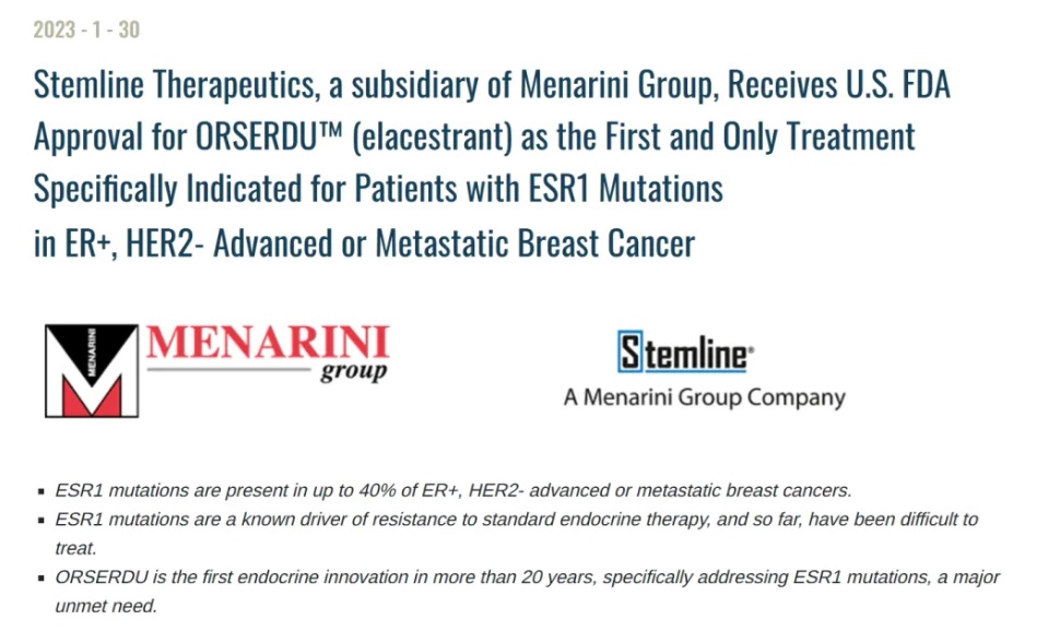 2、2023年1月,FDA批準Elacestrant(Orserdu)用于既往接受過至少一線內分泌治療后疾病進展的ER+、HER2-、ESR1突變的絕經后女性或成年男性晚期或轉移性乳腺癌患者。在美國和歐洲由Menarini的全資子公司Stemline Therapeutics將Orserdu商業(yè)化,這也是FDA批準的首個口服SERD(選擇性雌激素受體降解劑),在此之前,阿斯利康的氟維司群(fulvestrant)是唯一獲批上市的SERD靶向藥,但是只能肌肉注射。
