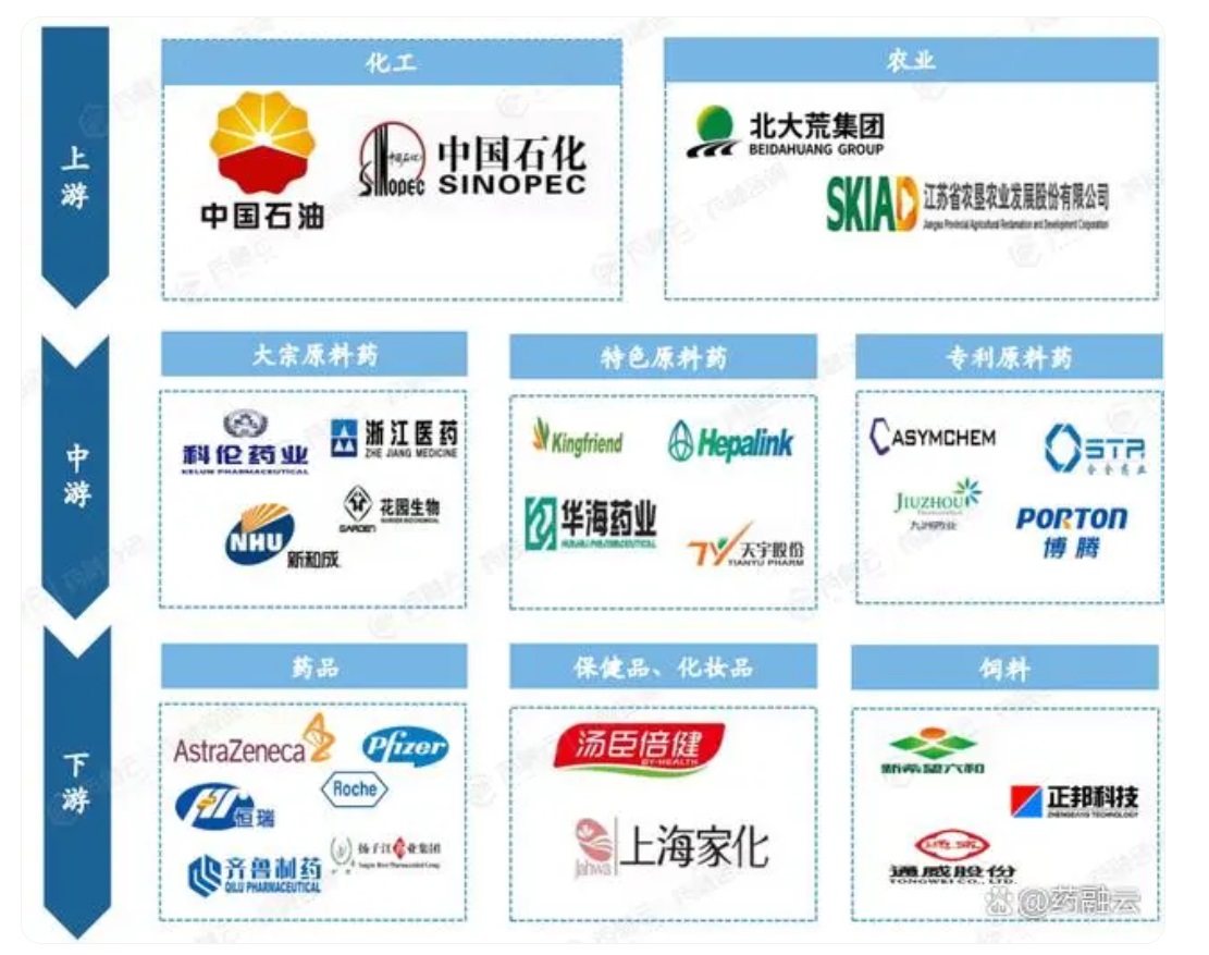 原料藥產(chǎn)業(yè)鏈涵蓋了上游的基礎(chǔ)化工和農(nóng)林牧漁業(yè),主要包括基礎(chǔ)化工、植物種植、動(dòng)物養(yǎng)殖和部分醫(yī)藥中間體制備等;中游的原料藥生產(chǎn),即通過(guò)化學(xué)合成、動(dòng)植物提取、微生物發(fā)酵或其他現(xiàn)代生物技術(shù)等制備得到原料藥;以及下游的化學(xué)制劑生產(chǎn)等多個(gè)環(huán)節(jié)。