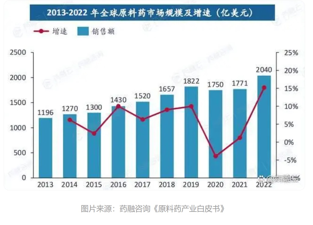 從全球范圍來(lái)看,原料藥市場(chǎng)在經(jīng)歷了2020年新冠疫情的沖擊后逐漸恢復(fù)增長(zhǎng)。全球原料藥市場(chǎng)規(guī)模在2020年受新冠肺炎疫情影響與2019年相比有所下滑,從1822億美元降至1750億美元,下降3.95%;但很快,市場(chǎng)從2021年開(kāi)始便恢復(fù)了增長(zhǎng),2022年全球原料藥市場(chǎng)規(guī)模達(dá)到2040億美元。