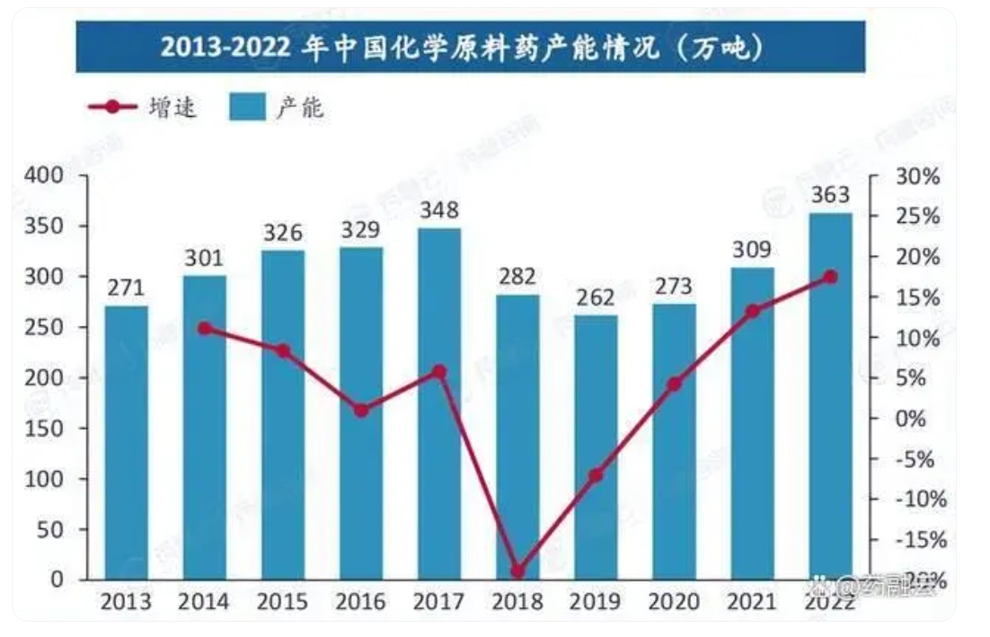國(guó)內(nèi)原料藥市場(chǎng)也呈現(xiàn)出相似的趨勢(shì)。在2013-2017年間中國(guó)原料藥的產(chǎn)能整體呈增長(zhǎng)趨勢(shì);但在2018-2019年受環(huán)保安全監(jiān)管趨嚴(yán)以及供給改革不斷深化的影響,一些高能耗、高污染、工藝技術(shù)落后、過(guò)剩的原料藥產(chǎn)能被淘汰,中國(guó)原料藥產(chǎn)能下降明顯;2020年我國(guó)原料藥市場(chǎng)開(kāi)始恢復(fù)增長(zhǎng),但受疫情影響,增長(zhǎng)緩慢,增速僅約為4.2%;從2021年開(kāi)始增長(zhǎng)速度加快,相比2020年增速約為13.2%;2022年中國(guó)原料藥產(chǎn)能已超過(guò)了2017年時(shí)最高產(chǎn)能,相比2021年增速約為17.5%。