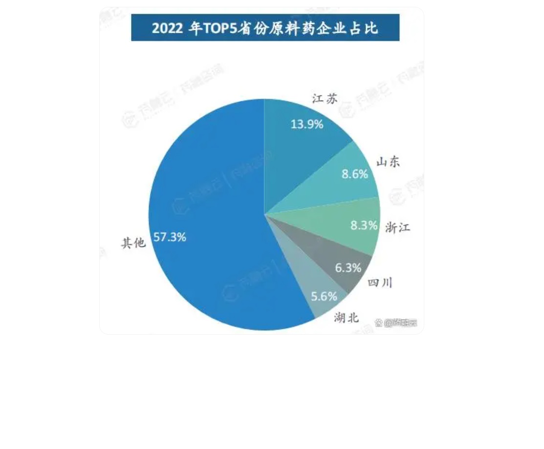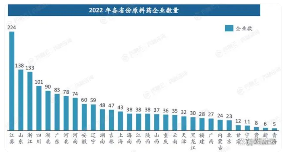 其中,企業(yè)數(shù)>100家的有4省,分別為江蘇(224家)、山東(138家)、浙江(133家)、四川(101家),4省合計(jì)占全國(guó)原料藥企業(yè)總數(shù)的近四成(37%)。