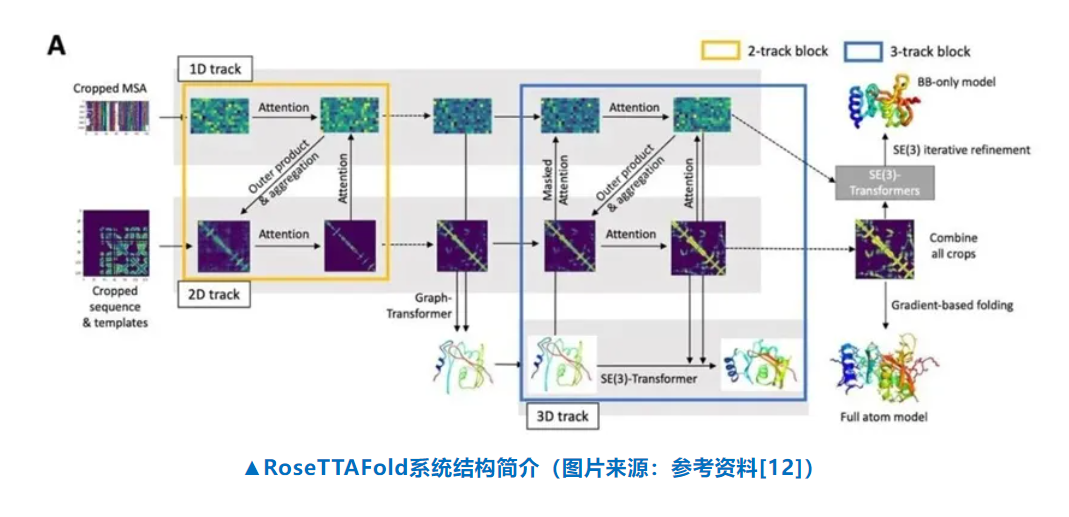 2003年,Baker的團隊設(shè)計出了第一個原本并不存在于自然界中的蛋白質(zhì),它被命名為Top7。這當然是一個重要突破,但卻沒有開辟一個嶄新的時代。Baker實驗室的成員開玩笑說Top7只是一塊從熱力學角度上看很穩(wěn)定的“石頭”。因為他們從頭設(shè)計出的這個蛋白質(zhì)雖然折疊成了研究人員們想要它折疊的模樣,但不具有任何功能。7年后,Baker的一名博士后研究員做出了改進。他將抗體的一部分連接到了人造蛋白上,使人造蛋白首度具有了功能:新合成的蛋白能識別流感病毒,有望成為一種新的藥物,但這多少有些“作弊”的意思,畢竟最重要的那部分來自天然的抗體。接下來的幾年時間,Baker的團隊對Rosetta進行了更多的優(yōu)化。如今,Baker的實驗室,以及他的合作伙伴們已能設(shè)計出多種不同的蛋白,有朝一日,人類完全獲得“上帝之手”的能力將不再是夢想。不過到目前,從頭設(shè)計蛋白依然是一個不斷試錯的工作,需要大量的資源投入。以設(shè)計結(jié)合蛋白為例,從流程上看,科學家會首先用Rosetta模擬出所感興趣蛋白表面上的一個“口袋”,然后再設(shè)計出大量不同的螺旋結(jié)構(gòu),形成穩(wěn)定骨架。這些骨架上含有一些特定的氨基酸,有可能會與“口袋”進行完美的契合。這個工作就像是在一把鑰匙上不斷打磨,最終使其完美地對應(yīng)一把鎖。隨后,研究人員們會根據(jù)設(shè)計合成所要的DNA序列,將其引入細菌細胞,期望它們能夠產(chǎn)生所需要的蛋白。獲取這些蛋白后,他們還會做兩個測試:評估這些蛋白是否能如預(yù)期般折疊,以及折疊后的蛋白是否能如預(yù)期般結(jié)合特定蛋白。通常來講,人工設(shè)計的蛋白極少能同時滿足這兩個條件。而那些脫穎而出的蛋白,則會成為新一輪設(shè)計與篩選的起點,直至獲得最佳的構(gòu)象。在2018年以前,Baker及其團隊開發(fā)的Rosetta在蛋白質(zhì)結(jié)構(gòu)預(yù)測領(lǐng)域完全沒有對手。而那一年,AlphaFold的出現(xiàn)令Baker嗅到了危機。盡管18年的蛋白質(zhì)結(jié)構(gòu)預(yù)測競賽依然是Rosetta拔得頭籌,但首次亮相就獲得了第二名的AlphaFold令Baker見識到了機器學習的過人之處。于是,他要求團隊緊跟時代的風向,加緊研究機器學習。Baker的預(yù)感沒有錯,在2020年的競賽中,第二代AlphaFold擊敗了Rosetta,一舉成名。不過,Baker率領(lǐng)著團隊很快就追趕了上來。2021年7月15日,當DeepMind公司在《自然》雜志上發(fā)表論文,公開了“AlphaFold2”的源代碼,并且詳細描述了它的設(shè)計框架和訓練方法時,Baker的團隊也于《科學》雜志上介紹了其開發(fā)的RoseTTAFold算法。RoseTTAFold的神經(jīng)網(wǎng)絡(luò)能夠同時考慮蛋白序列的模式、蛋白中不同氨基酸之間的相互作用,以及蛋白質(zhì)可能出現(xiàn)的3D結(jié)構(gòu)。在這個系統(tǒng)中,一維、二維和三維的信息能夠相互交流,讓神經(jīng)網(wǎng)絡(luò)綜合所有信息,決定蛋白質(zhì)的化學組成部分和它折疊產(chǎn)生的結(jié)構(gòu)之間的關(guān)系。